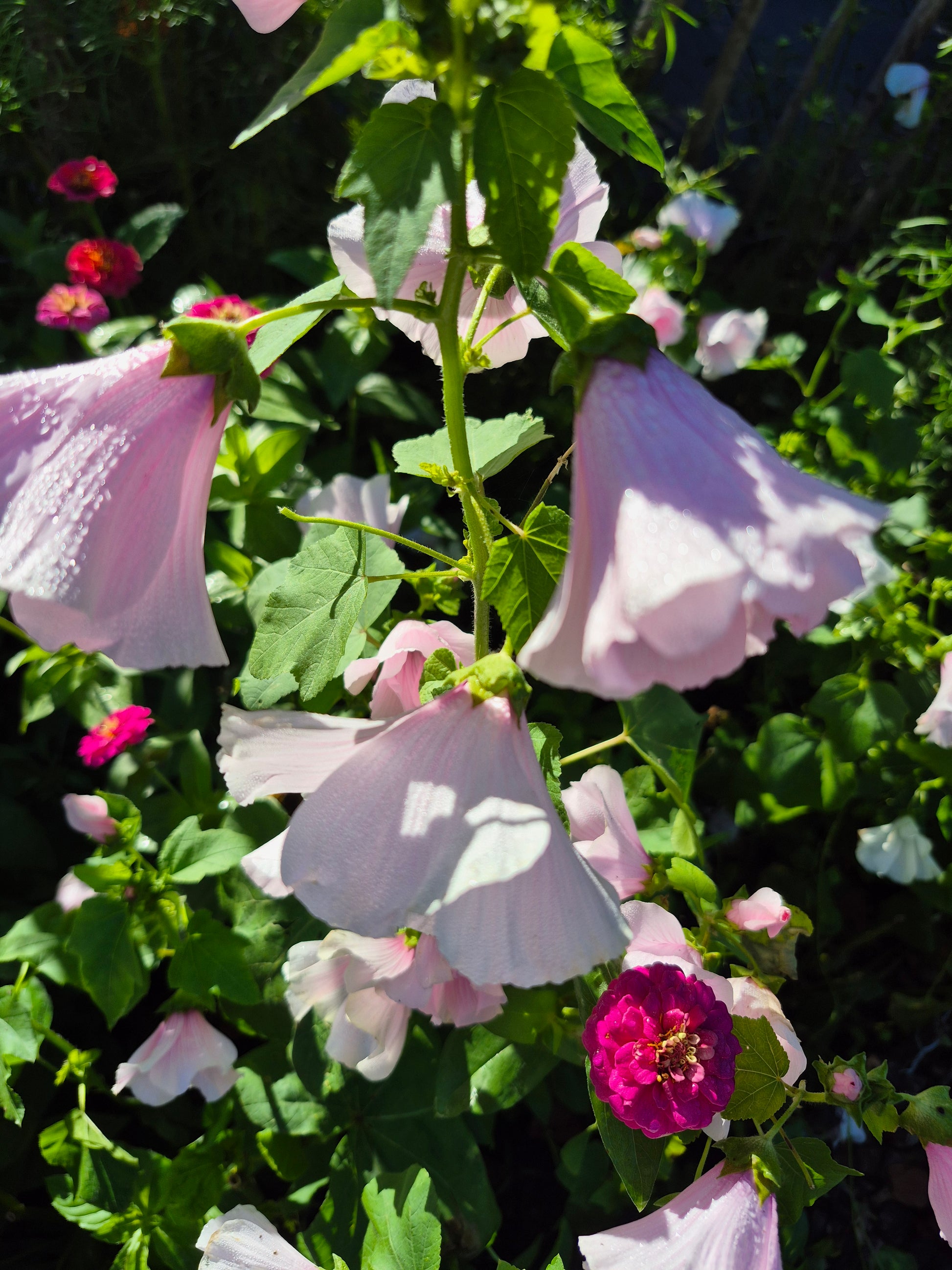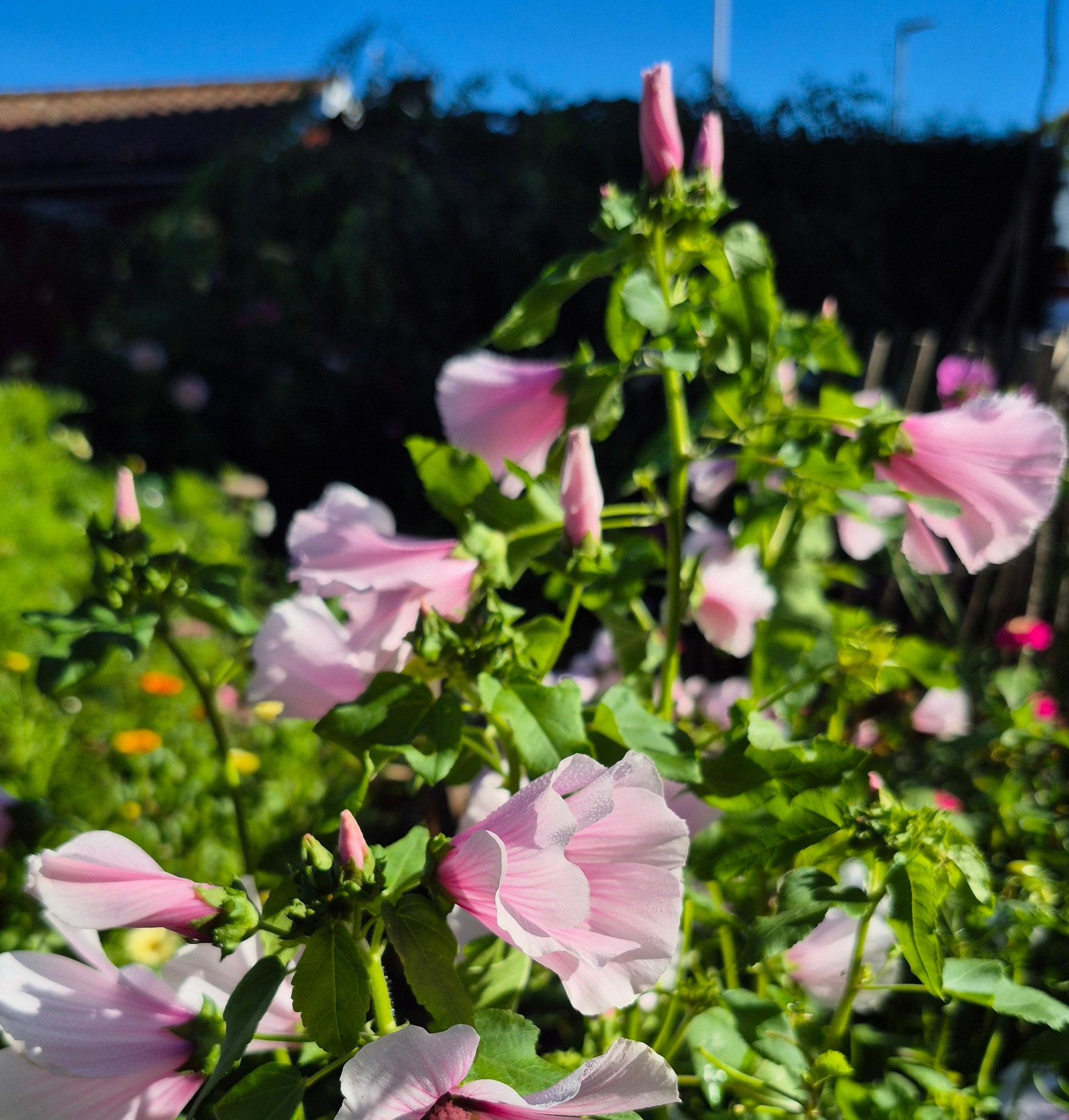 Jag upptäckte malvan ganska sent – kanske för att den på nära håll kan påminna om petunia, som jag ofta köper färdig. Men till skillnad från petunian är malvan hög och ståtlig, med stora klockformade blommor. Dess naturligt förgrenade växtsätt skapar ett hav av färg.